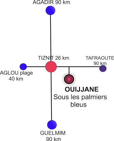 A partir de Tiznit prendre la N 104 direction Tafraoute, faire 13 km prendre à droite direction OUIJJANE,13 km,traverser le village de ouijjane jusqu'au panneau "Sous les palmiers bleus"